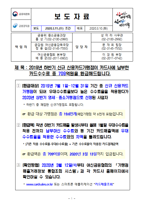 200312-(±ÝÀ¶À§¿øÈ¸) 2019³â ÇÏ¹Ý±â ½Å±Ô ½Å¿ëÄ«µå°¡¸ÍÁ¡ÀÌ Ä«µå»ç¿¡ ³³ºÎÇÑÄ«µå¼ö¼ö·á Áß 709¾ï¿øÀ» ȯ±ÞÇØµå¸³´Ï´Ù.pdf (2.5M)